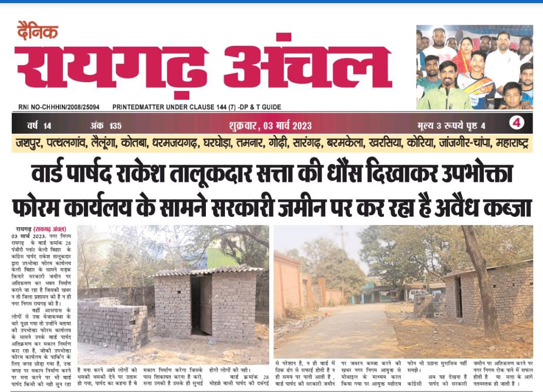नगर निगम रायगढ़ के वार्ड क्रमांक 28 पंजीरी प्लांट केलो विहार के कांग्रेस पार्षद राकेश तालूकदार द्वारा उपभोक्ता फोरम कार्यलय केलो विहार के सामने सड़क किनारे सरकारी जमीन पर अतिक्रमण कर भवन निर्माण कराने जा रहा है जिसकी खबर न तो जिला प्रशासन को है न ही नगर निगम रायगढ़ को है, वही आसपास के लोगों से उक्त बेजाकब्जा के बारे पूछा गया तो उन्होंने बताया की उपभोक्ता फोरम कार्यलय के सामने उनके वार्ड पार्षद अतिक्रमण कर मकान निर्माण करा रहा है, जोकी उपभोक्ता फोरम कार्यलय के पार्किंग के लिए जगह छोड़ा गया है, उक्त जगह पर मकान निर्माण करने पर मना करने पर भी वार्ड पार्षद किसी की नही सुन रहा है मना करने आये लोगों को धमकी चमकी देने पर उतारू हो गया, पार्षद का कहना है वे मकान निर्माण करेगा जिसके पास शिकायत करना है करो सत्ता उनकी है उसके ही सुनाई होगी लोगों की नही वार्ड क्रमांक 28 मोहल्ले वासी पार्षद की दबंगई से परेशान है, न ही वार्ड में ठिक ढंग से सफाई होती है न ही समय पर पानी आती है , वार्ड पार्षद की सरकारी जमीन पर जबरन कब्जा करने की खबर नगर निगम आयुक्त से मोबाइल के माध्यम काल किया गया पर आयुक्त महोदय फोन भी उठाना मुनासिब नहीं समझे।